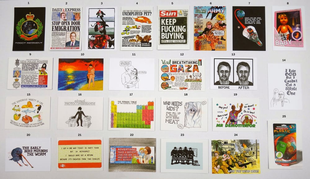 All cards have additional smaller black and white images printed on the other side. On the Baby's First Baby and Multicoloured Bits of Plastic cards these images take up the entire section where you would normally write.